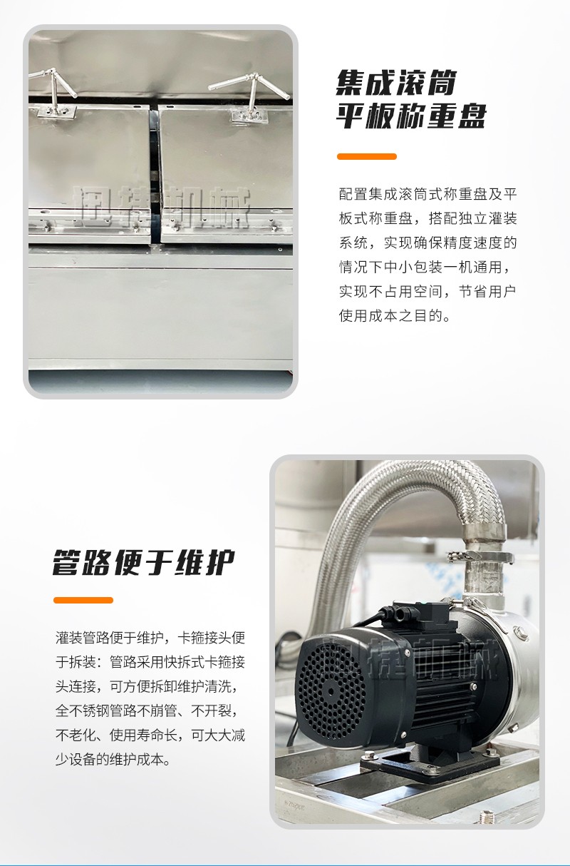 集成滾筒、平板稱重盤,一機(jī)多用,方便快捷:配置集成滾筒式稱重盤及平板式稱重盤,搭配獨(dú)立灌裝系統(tǒng),實現(xiàn)確保精度速度的情況下中小包裝一機(jī)通用,實現(xiàn)不占用空間,節(jié)省用戶使用成本之目的。