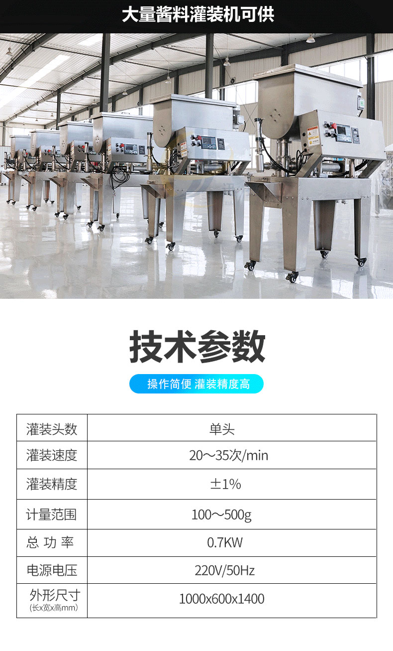 半自動(dòng)醬料灌裝機(jī)適用于辣椒醬、豆瓣醬、拌面醬、大塊肉醬等物品的定量充填分裝,適用于將各類粘稠體及含有各種固體物質(zhì)
