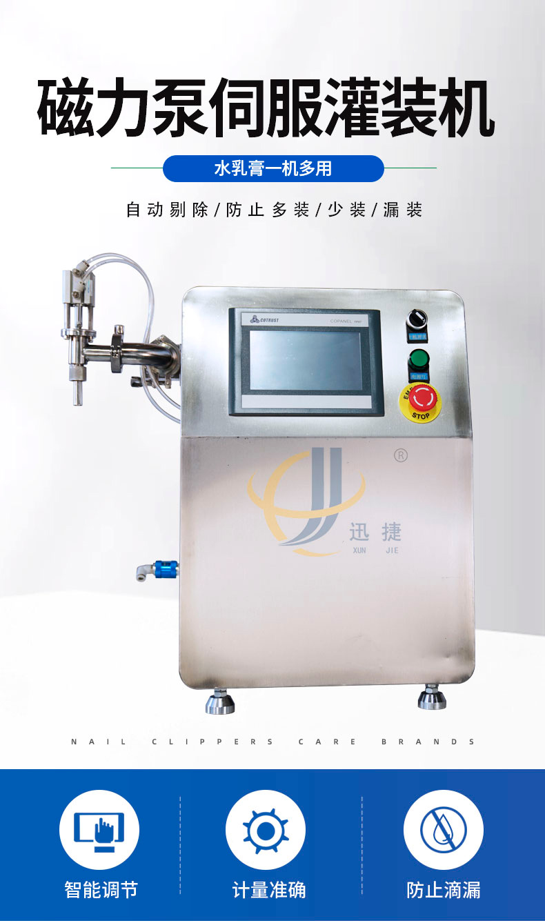 1.本機采用伺服電機驅動,PLC和觸摸屏控制,316L材質齒輪泵灌裝原理,適合日化、醫藥、食品、油脂等各類流體和半流體物料定量灌裝。2.灌裝量通過觸摸屏調節,灌裝量調節無上限,泵頭易拆裝易清洗,非常適合產品種類多,需要經常調節范圍的用戶。3.計量準確,灌裝100ML,可以實現不大于0.5ML的誤差。